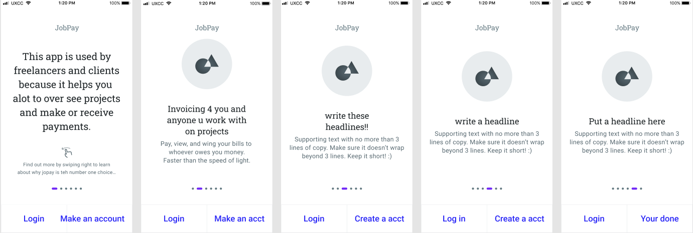 Solution: I kept the headlines short and actionable to show users right away how JobPay can help them. I revised the button UI copy to make it clear and consistent across.
